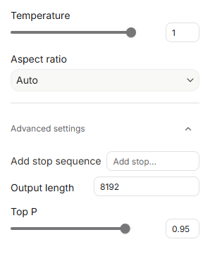 Google AI Studio 내 모델 세부 설정(Advanced settings) 화면 일부로, AI 응답 스타일과 결과값을 세밀하게 조절할 수 있는 옵션들입니다.